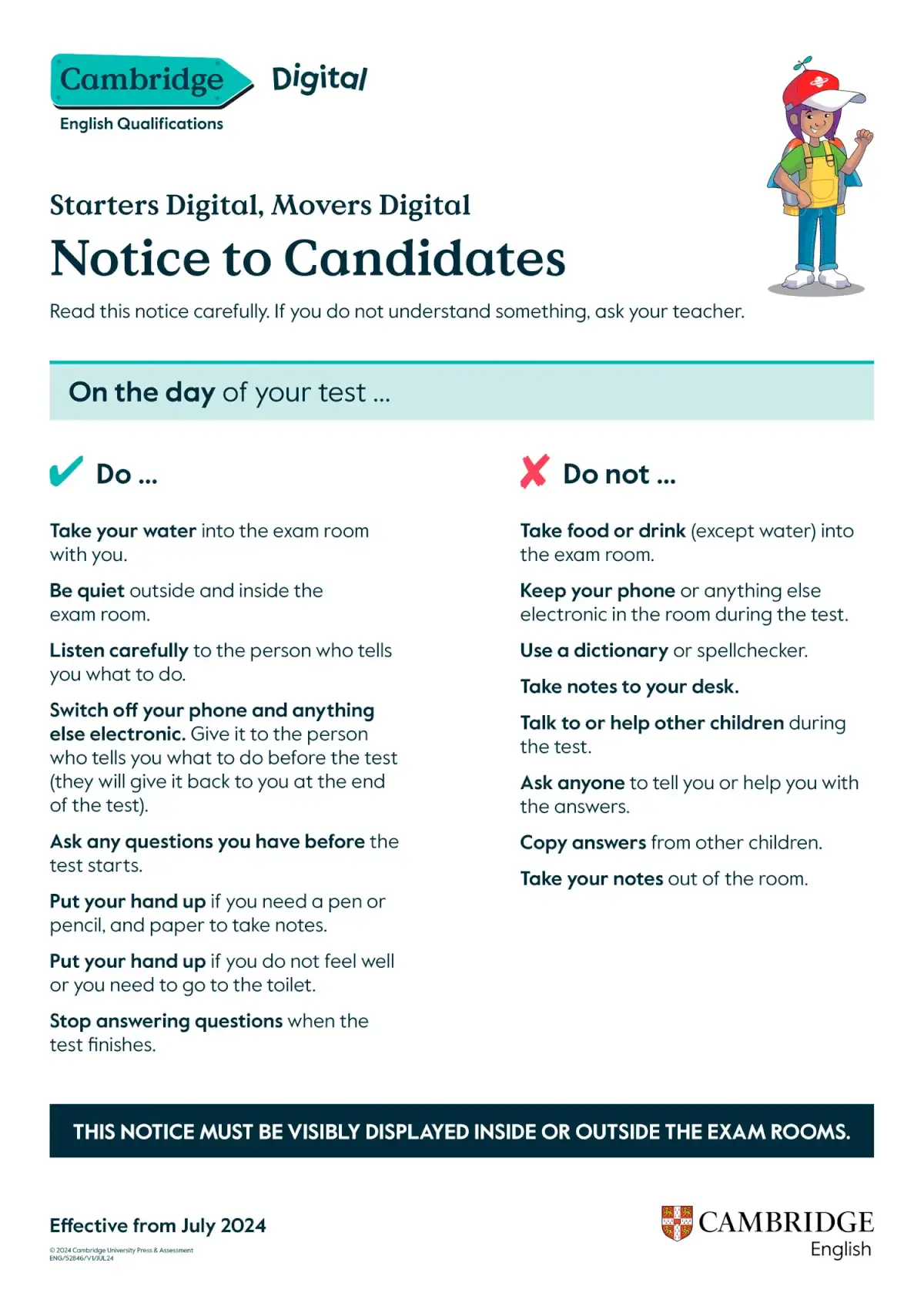 1. Any candidate not following Cambridge English regulations and the Centre’s instructions, or whose behaviour is disruptive, may not be allowed to take or finish their exam and/or may be subject to Cambridge English Malpractice procedures, as per details on cambridgeenglish.org/help/malpractice